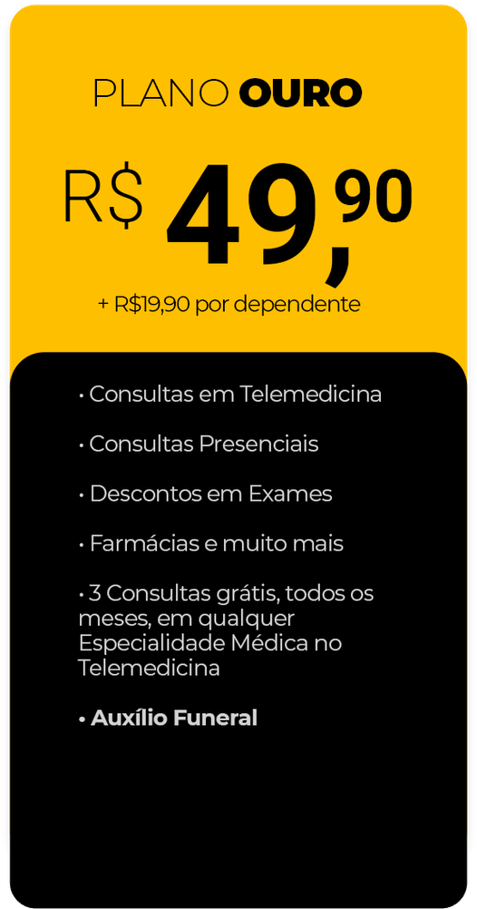 O Plano Ouro é o nosso pacote premium, que inclui todos os benefícios do Plano Prata mais auxílio funeral e acesso ilimitado a consultas presenciais. Este plano é ideal para quem busca a cobertura mais completa e atendimento prioritário.