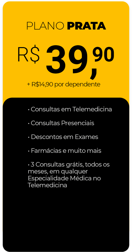 Descontos em consultas, exames, medicamentos e até 3 consultas grátis por mês via telemedicina.